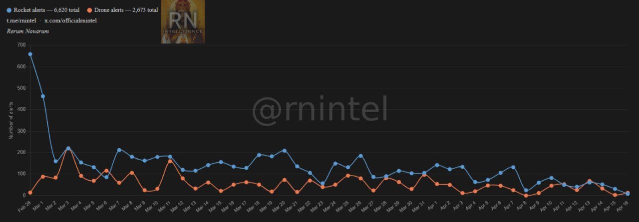 From April 8 to April 16, alerts decreased to 748. An average of 3.46 per hour, or one every 17 minutes. This means that the alert rate decreased by about 46.5% after Iran withdrew from the war.